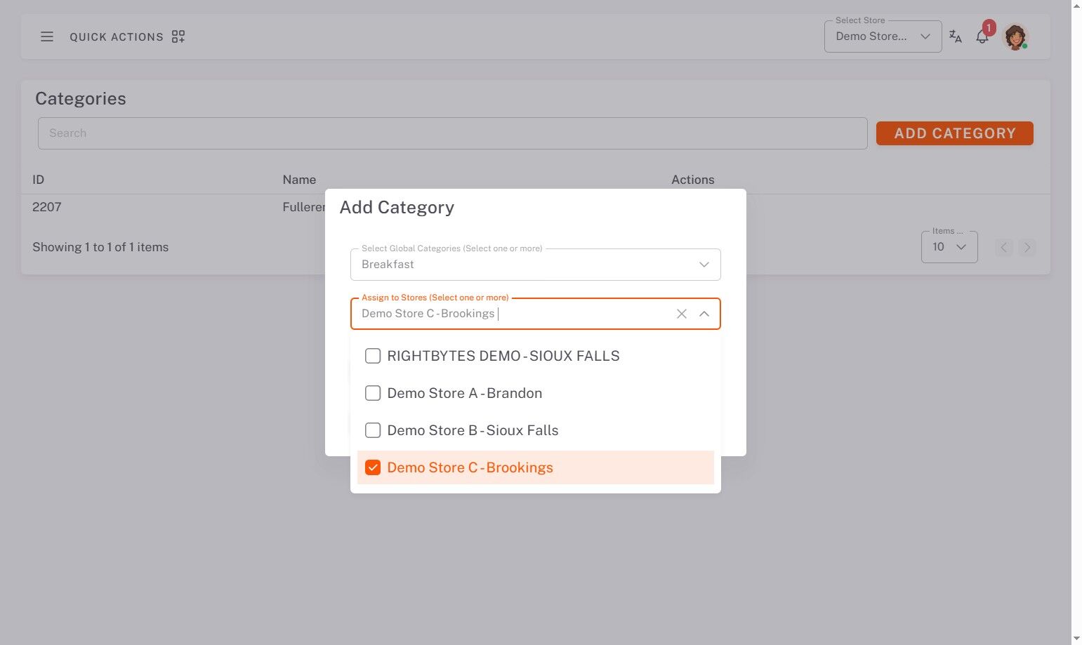 4. Click the Assign to Stores dropdown, and check all stores that need this category.